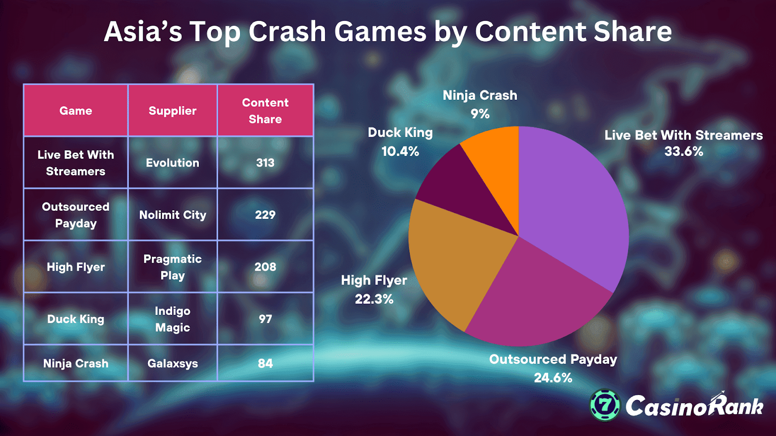 Vi på CasinoRank har analyserat de senaste trenderna för att avslöja de mest spelade crashspelen 2025. Med hjälp av omfattande data från iGaming Tracker och dussintals ledande operatörer har vi kartlagt de regionala ledarna, de bäst presterande studiorna och de skiftande spelarpreferenserna som formar denna dynamiska kategori. Från Pragmatic Plays globala succé Högflygare Till Evolutions djärva hybridformat belyser denna genomgång vart branschen är på väg – och hur du kan hålla jämna steg.