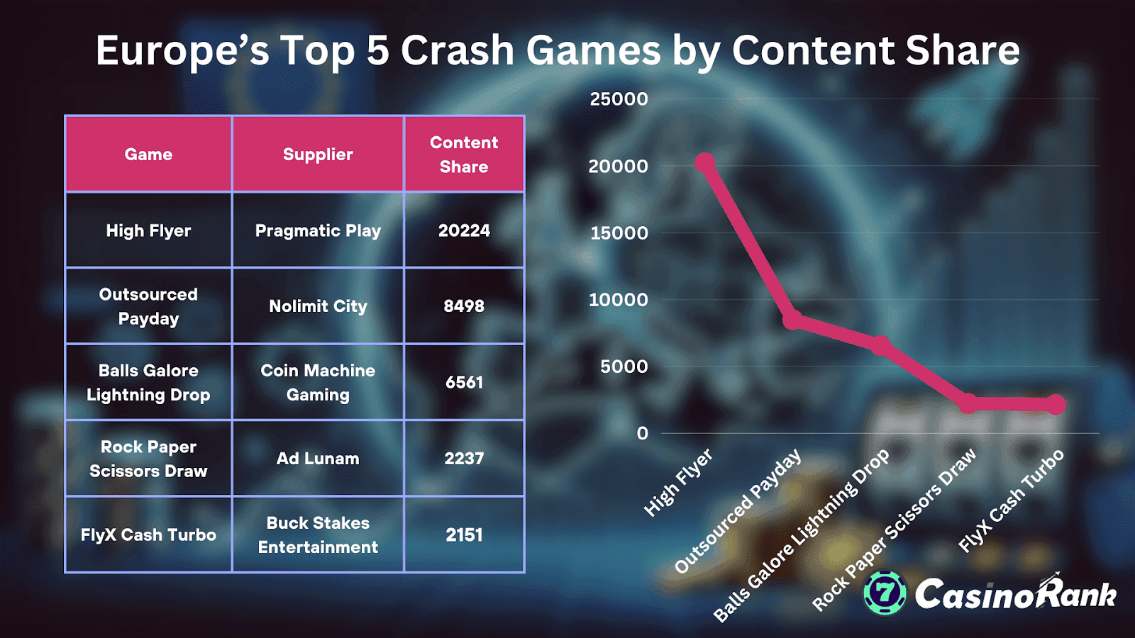 - Högflygare (Pragmatiskt spel): Har en imponerande innehållsandel på 20 224, till stor del tack vare dess sömlösa integration med casinolobbyer och uppslukande spelupplevelse.
