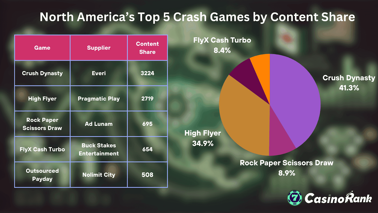 - Crush Dynasty (Everi): Dominerar med en innehållsandel på 3 224 och fångar essensen av fartfyllt, arkadliknande nöje.