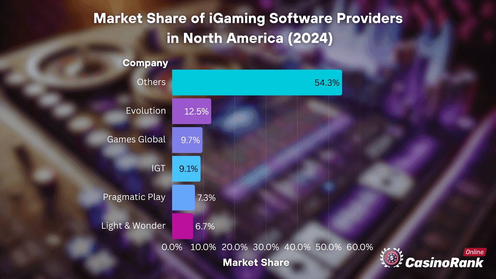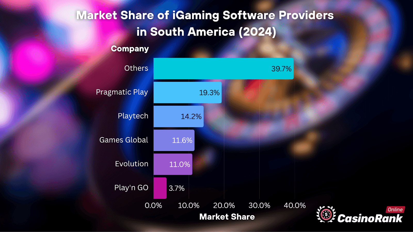 I Sydamerika kännetecknas iGaming-marknaden av en mångfald av leverantörer som konkurrerar om marknadsandelar. Fördelningen av marknadsandelar är följande: